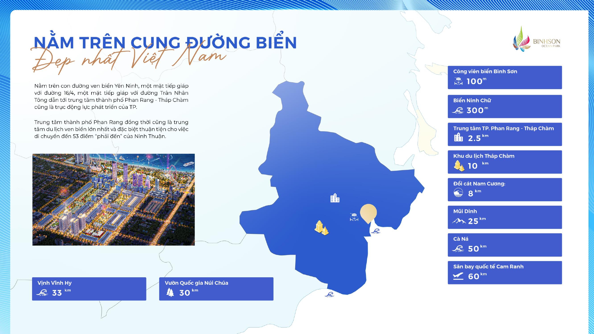 “VỊ TRÍ ĐỘC TÔN” không còn dự án thứ 2 trên bản đồ thị trường BĐS Việt Nam. Bình Sơn Ocean Park được ví như lõi trung tâm của trung tâm TP. Phan Rang. Xứng tầm với các trung tâm Trần Phú- Nha Trang, Võ Nguyên – Giáp Đà Nẵng, Xuân Diệu – Quy Nhơn, Độc Lập – Phú Yên.