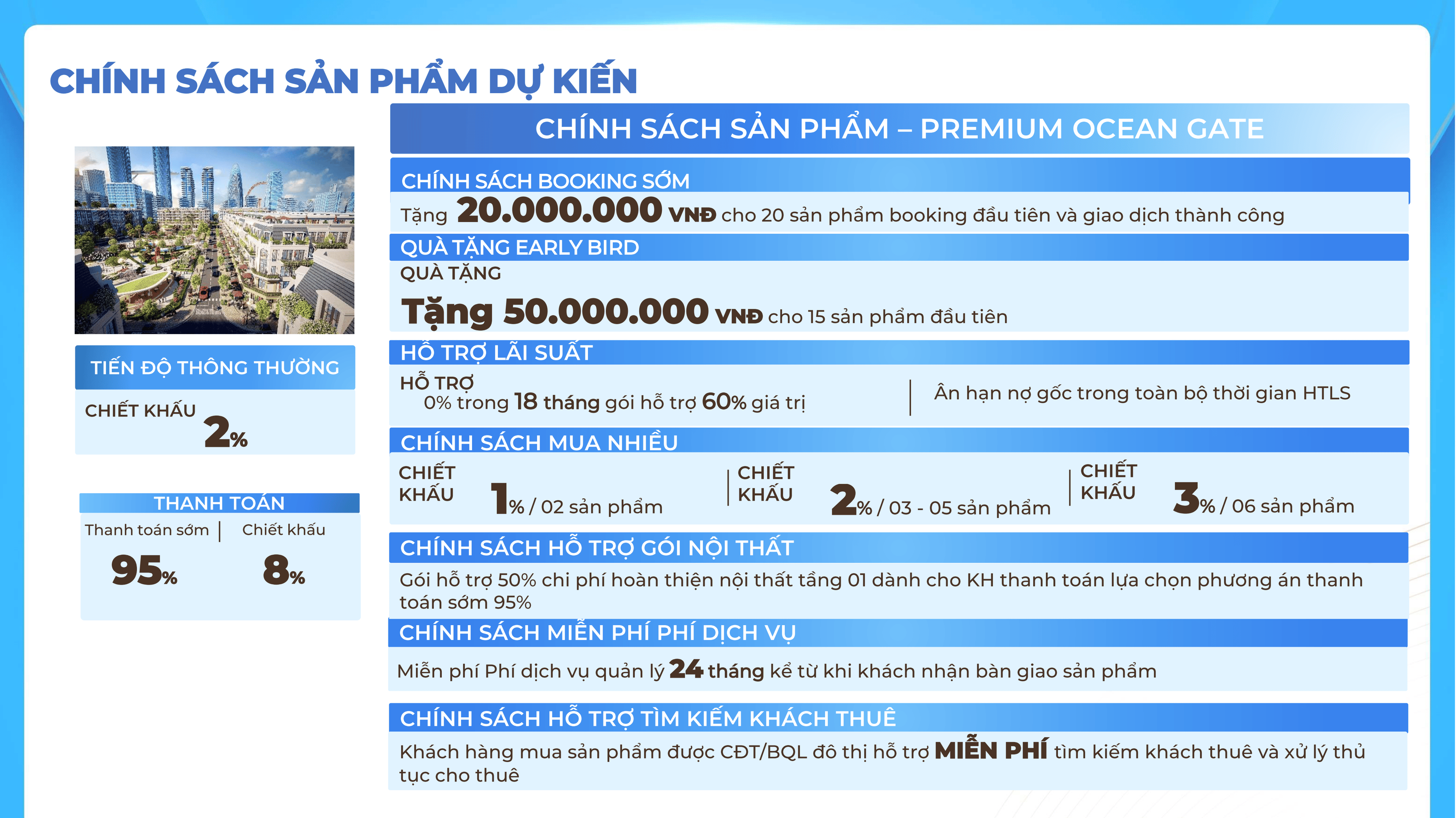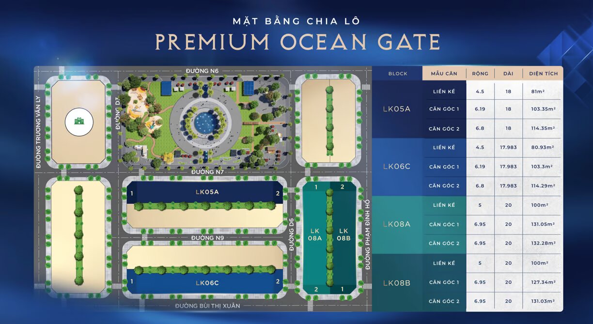 – Mở bán giai đoạn 1 phân khu Premium Ocean Gate gồm 58 Căn Đâu Tiên Lk5a Lk6b Lk8 diện tích 80 – 100 m2 , Diện tích xây dựng 330 – 572 m2